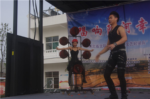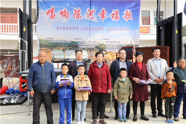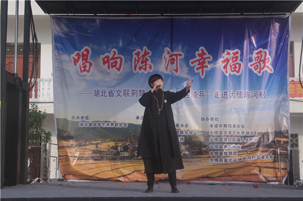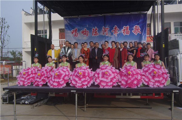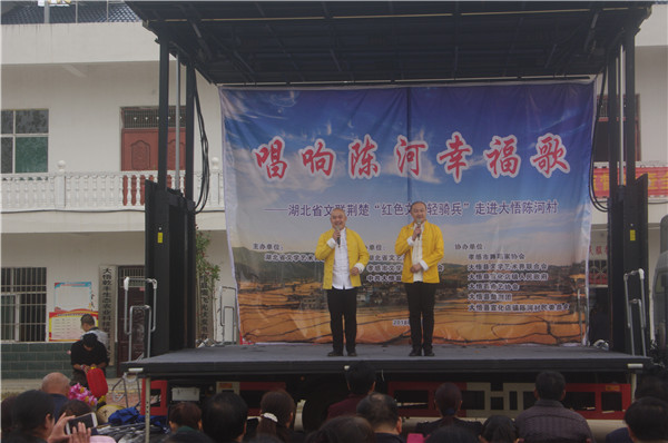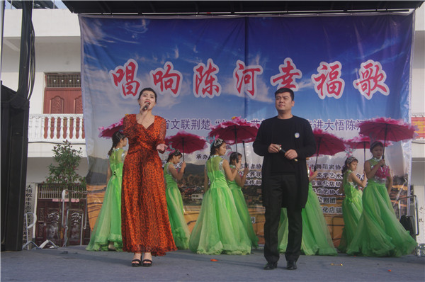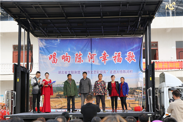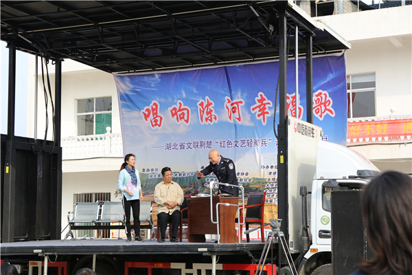 14時30分,“唱響陳河幸福歌”暨省文聯荊楚“紅色文藝輕騎兵”演出正式開始。湖北省文藝志愿者、湖北電視臺主持人田揚、武漢歌舞劇院的雷佩佩主持演出。秦德松、楊蕾、蔡邸昕、劉智鵬、程卿、伍莉、周錦堂、鄭志方、尹北琛、胡蕊藍、張建龍、馬麗、程娜、蔣紅玲、寧俊民、祝家家、王敏、朱瑾等文藝志愿者輪番登場,為現場的父老鄉親送去了精彩的文藝節目,用文化的感染力和號召力激發貧困群眾合力脫貧攻堅的信心和決心,為打贏脫貧攻堅戰營造出良好的氛圍。