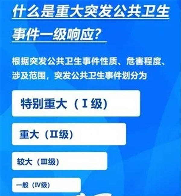 根據(jù)《中華人民共和國傳染病防治法》和《國家突發(fā)公共衛(wèi)生事件應(yīng)急預案》,國家建立傳染病預警制度。按照突發(fā)公共衛(wèi)生事件性質(zhì)、危害程度、涉及范圍,突發(fā)公共衛(wèi)生事件劃分為特別重大(Ⅰ級)、重大(Ⅱ級)、較大(Ⅲ級)和一般(Ⅳ級)四級,一級響應(yīng)為最高響應(yīng)級別。