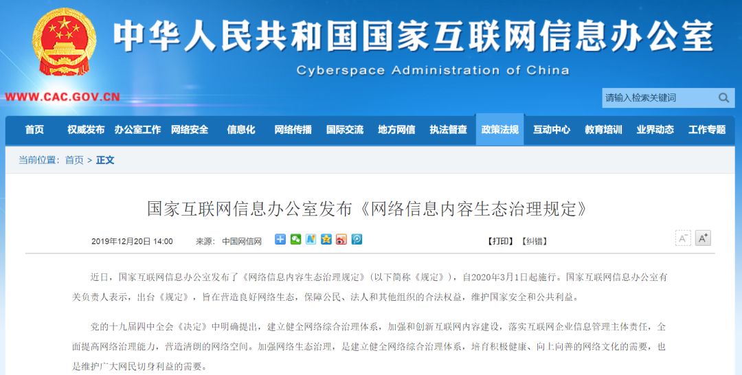 《網絡信息內容生態治理規定》已經國家互聯網信息辦公室室務會議審議通過,現予公布,自2020年3月1日起施行。