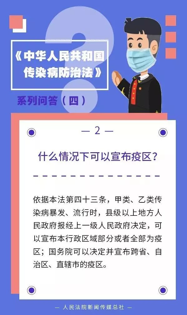 當前,新型冠狀病毒感染肺炎疫情蔓延,正嚴重影響著社會正常生產生活秩序。傳染病防治關系到每一個人的生命健康。面對傳染病的肆虐,如何利用法律武器來抗擊疫情?您對傳染病防治法知多少?小編將為您作出系列介紹。小編將為您作出系列介紹。今天推出系列問答之四,敬請關注!