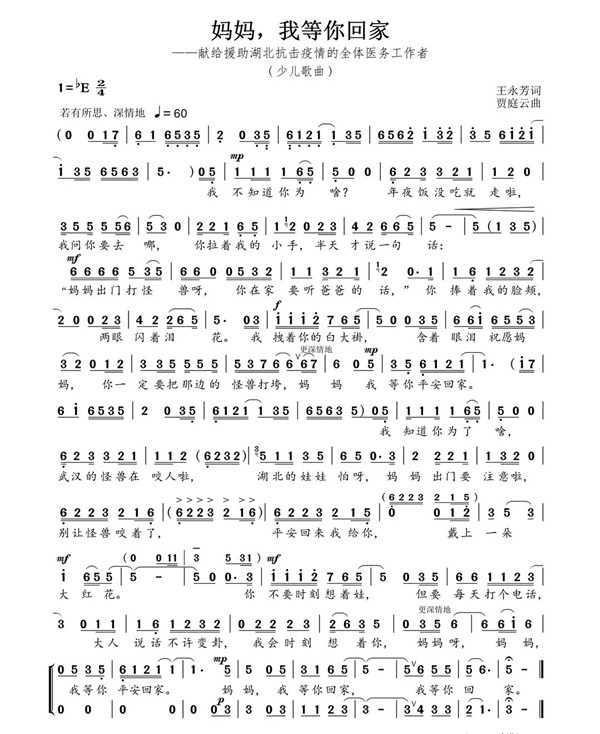 由王永芳作詞、賈庭云作曲的少兒歌曲《媽媽,我等你回家》,以醫護人員兒女視角出發,在純凈童聲中唱出對戰“疫”前線母親的思念與愛,直擊心靈、感人至深。