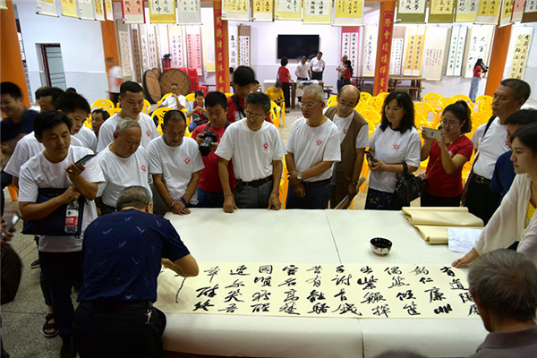 上午10時(shí),著名書法家、省書協(xié)副主席夏奇星、童德昭,省青年書協(xié)副主席吳永斌,黃石市書協(xié)副主席王榮組成書法文藝志愿小分隊(duì),在姜橋村文化禮堂為當(dāng)?shù)貢◥酆谜邔n}授課,以“廉風(fēng)潤荊楚”為主題的現(xiàn)場書法示范,并創(chuàng)作數(shù)十幅宣傳廉政新風(fēng)、歌頌農(nóng)村新貌的書法作品,在演出現(xiàn)場贈送給大冶市新時(shí)代文明實(shí)踐中心、姜橋村文化禮堂。