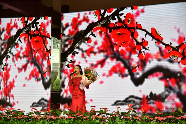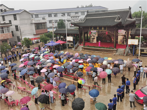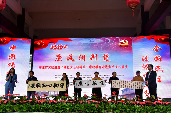 下午3時(shí),在綿綿的秋雨中,由省內(nèi)藝術(shù)家組成的荊楚“紅色文藝輕騎兵”表演了13個宣傳廉政新風(fēng)、謳歌偉大時(shí)代、歌頌農(nóng)村新貌的文藝節(jié)目。演出由湖北省最美文藝志愿者、湖北衛(wèi)視主持人段建海和王惠主持,大冶市美人魚舞蹈團(tuán)表演的《楚天鼓魂》拉開了演出序幕,湖北省最美文藝志愿者祝家家?guī)砀枨缎腋nI(lǐng)悟》,詮釋了不忘初心,牢記使命,心系民生,廉政執(zhí)法,倡導(dǎo)知敬畏守底線,清廉實(shí)干擔(dān)當(dāng)?shù)膬?nèi)涵。張彬、賈靜美子、車鵬表演的群口快板《廉政建設(shè)譜新篇》,胡蕊藍(lán)演唱的歌曲《家風(fēng)》,兩上央視春晚的國家一級演員周錦堂、鄭志方、尹北琛表演的小品《在路上》等節(jié)目,用不同的表演形式,從不同側(cè)面,反映了“廉政潤荊楚”的主題。中國京劇梅花獎得主、國家一級演員王小嬋表演的京劇《沙家浜》選段《祖國的好山河寸土不讓》,湖北省最美文藝志愿者、央視青歌賽銀銅獎得主陳春茸、胡承忠演唱的《這個日子真好》《奮進(jìn)新時(shí)代》,湖北省最美文藝志愿者、歌劇《洪湖赤衛(wèi)隊(duì)》第四代韓英扮演者馬婭琴歌曲《紅梅贊》,湖北省最美文藝志愿者、央視青歌賽銅獎得主萬莉演唱的《快樂的人請鼓掌》,湖北省文藝志愿者、青年舞蹈演員宋樂樂、許峰的雙人舞《哥哥》以及由大冶市文聯(lián)選送的兩上央視的吳莎演唱《姜橋美》等,演員傾情演繹,觀眾冒雨觀看,臺上好戲連臺,臺下好評如潮。有老人現(xiàn)場驚呼:“周錦堂、王小嬋,這是真人嗎?我在電視里頭看到的人,真的到我們村里來了。”姜橋村村干部看完演出后,深有感觸地說:“書法培訓(xùn)和示范,接地氣;演出節(jié)目編排精細(xì),聚人氣。作為基層黨員干部,我們一定要做廉潔自律的表率,模范遵守各項(xiàng)紀(jì)律和法律”。