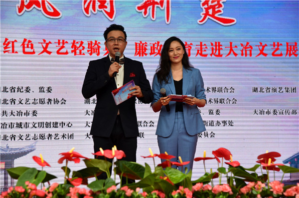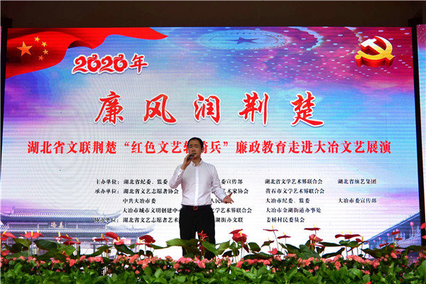 活動由省紀(jì)委監(jiān)委、省委宣傳部、省文聯(lián)、省演藝集團(tuán)主辦,省文藝志愿者協(xié)會、省電視藝術(shù)家協(xié)會、黃石市文聯(lián)、大冶市委市政府、大冶市紀(jì)委監(jiān)委、大冶市委宣傳部、大冶市城市文明創(chuàng)建中心、金湖街道辦事處、大冶市文聯(lián)共同承辦。省文聯(lián)黨組成員、副主席馬尚云,省紀(jì)委監(jiān)委宣傳部副部長吳明新,省紀(jì)委監(jiān)委駐省委宣傳部紀(jì)檢監(jiān)察組辦公室主任劉銳等出席活動。大冶市委常委、宣傳部長左高峰表示,省文聯(lián)荊楚“紅色文藝輕騎兵”廉政教育走進(jìn)大冶文藝展演活動,旨在通過送“紀(jì)”下鄉(xiāng),把廉潔教育貫穿到群眾喜聞樂見的文藝節(jié)目當(dāng)中,在荊楚大地營造出“崇廉尚廉”的良好社會氛圍,通過廉政公益宣傳,引導(dǎo)黨員干部自覺筑牢拒腐防變的思想防線,在全社會形成崇廉、尊廉、尚廉、促廉的良好風(fēng)氣,讓廉潔之花開遍銅都大地。