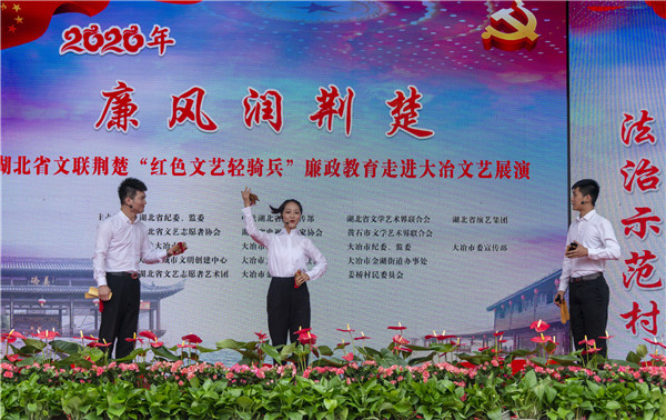 9月14日,在全省第二十一個黨風(fēng)廉政建設(shè)宣教月活動之際,省文聯(lián)荊楚“紅色文藝輕騎兵”廉政教育走進(jìn)大冶文藝展演活動,在有著“楚天第一水鄉(xiāng)”、省美麗鄉(xiāng)村試點(diǎn)村、省法治文化示范村的金湖街辦姜橋村舉辦。