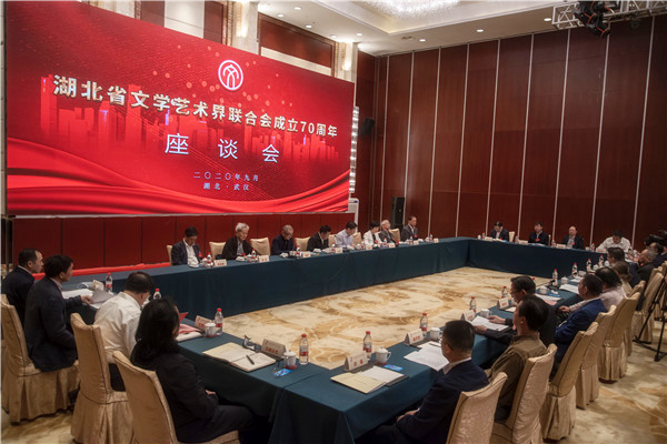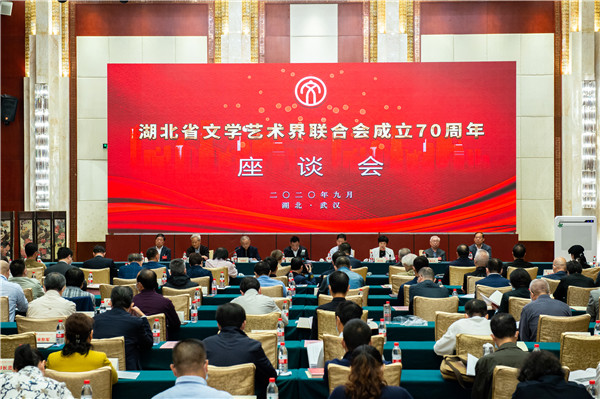 座談會在莊嚴的國歌聲中開始。省委宣傳部常務副部長鄧務貴宣讀中國文聯和省委發來的賀信。賀信中,中國文聯和湖北省委向全省廣大文藝工作者表示熱烈祝賀和誠摯問候,并充分肯定了湖北省文聯和湖北文藝70年來的光輝歷史與重要貢獻,對做好新時代湖北文藝工作提出了明確要求,希望湖北省文聯和湖北廣大文藝工作者立足新時代,肩負新使命,實現新擔當、新作為。