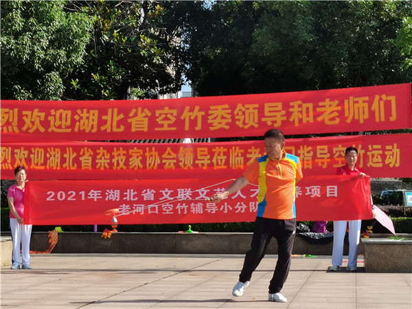 老河口市雖然是一個縣級市,但是有兩支空竹隊伍,一百多位空竹會員,是我省縣市區里空竹會員最多的城市。應老河口市空竹會員的要求,省文聯文學藝術院、省雜協邀請了省雜協空竹運動委員會的鄧格生、黃文勝、李翠華等國內有一定知名度的空竹教練,成立了“湖北雜技(空竹)老河口輔導小分隊”,赴老河口開展為期四天的空竹輔導培訓工作。