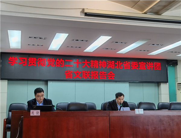11月18日上午,省文聯舉辦學習貫徹黨的二十大精神宣講報告會,省委宣講團成員,武漢大學法學院副院長、教授、博士生導師祝捷作宣講報告。會議由省文聯黨組書記、常務副主席張士軍同志主持,黨組成員、副主席、一級巡視員肖偉池,黨組成員、副主席王永平出席。省文聯機關、協會、文學藝術院干部職工,今古傳奇傳媒集團各企業負責人共70余人在現場參加會議,省文聯業務主管社會組織黨支部書記、委員通過騰訊會議收聽收看報告會。