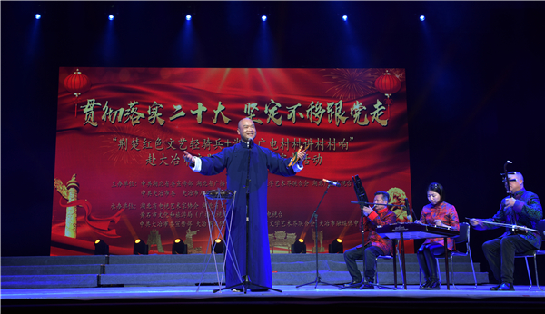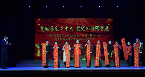 1月16日,省文聯(lián)“貫徹落實(shí)二十大 堅(jiān)定不移跟黨走——荊楚紅色文藝輕騎兵+‘村村講村村響’”基層主題宣講和新春慰問文藝演出活動(dòng)在大冶舉辦。省廣電局黨組成員、副局長(zhǎng)汪長(zhǎng)君,省文聯(lián)黨組成員、副主席王永平,黃石市委常委、大冶市委書記郝勝勇等領(lǐng)導(dǎo)出席活動(dòng)。