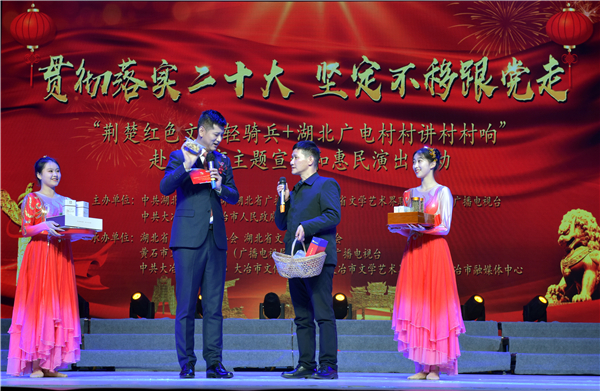 在熱情洋溢的舞蹈《荊楚歡歌新時(shí)代》中,活動(dòng)拉開序幕。演出由首屆全國(guó)學(xué)雷鋒文藝志愿服務(wù)“時(shí)代風(fēng)尚”最美文藝志愿者、湖北省文藝志愿團(tuán)團(tuán)長(zhǎng)尤一心執(zhí)導(dǎo),由著名導(dǎo)演郭光俊監(jiān)制,演出現(xiàn)場(chǎng)名角云集,精彩紛呈。《春天的祝?!贰短煲腥A》《美麗中國(guó)》《把一切獻(xiàn)給黨》等飽含深情的歌曲表達(dá)了中華兒女對(duì)祖國(guó)母親、偉大的中國(guó)共產(chǎn)黨最深情、最美好的祝福和最深沉、最難舍的依戀;《長(zhǎng)江從我家門前走過》《銅草花》《竹趣》等一批富有荊楚韻味和本土風(fēng)情的節(jié)目,引發(fā)了觀眾們的強(qiáng)烈共鳴;中國(guó)戲劇梅花獎(jiǎng)獲得者、青年楚劇表演藝術(shù)家余維剛帶來的楚劇《推車趕會(huì)》余音繞梁、讓人回味無窮;青年川劇演員胡啟文近距離表演《變臉》,現(xiàn)場(chǎng)氣氛熱烈;中國(guó)曲藝“牡丹獎(jiǎng)”獲得者徐寧演繹的湖北大鼓《放歌二十大》,展現(xiàn)了湖北貫徹落實(shí)黨的二十大的精神風(fēng)貌。借助現(xiàn)場(chǎng)舞臺(tái)以及各大網(wǎng)絡(luò)直播平臺(tái),大冶市鄉(xiāng)村振興局局長(zhǎng)吳映波和主持人一道“直播帶貨”,向現(xiàn)場(chǎng)觀眾、村村響聽眾和廣大網(wǎng)友推介殷祖白茶、鐵皮石斛、金牛千張、龍鳳山黑五類等當(dāng)?shù)靥厣a(chǎn)品,為地方經(jīng)濟(jì)發(fā)展加油。