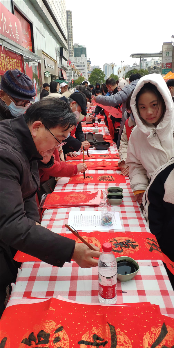 下午,省文聯(lián)“萬福下鄉(xiāng)”書法小分隊(duì)寫春聯(lián)送福字惠民活動(dòng)在銅鑼灣廣場(chǎng)舉行,省書法家協(xié)會(huì)副主席吳永斌、長(zhǎng)江書法院院長(zhǎng)張傳斌、省書畫家協(xié)會(huì)秘書長(zhǎng)胡常青、省廣電局老干處處長(zhǎng)丁俊、省廣電局宣傳處二級(jí)調(diào)研員陳振國(guó)等書法家現(xiàn)場(chǎng)揮墨,為大冶市父老鄉(xiāng)親們書寫對(duì)聯(lián)和福字,接過春聯(lián)的百姓無不歡心鼓舞,臉上洋溢著對(duì)新春的喜悅,對(duì)幸福生活的向往和對(duì)祖國(guó)繁榮昌盛的美好期待。