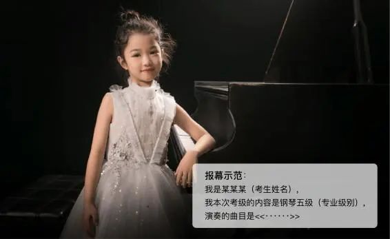 6.報幕要求:每條視頻均需要進行報幕,考級學生在開始演奏(演唱)前,必須正面朝攝像手機,以便實現人臉識別,清晰報出本人姓名、專業、級別和曲目名稱后,開始演奏(演唱)錄制,樂曲重復部分可不演奏。