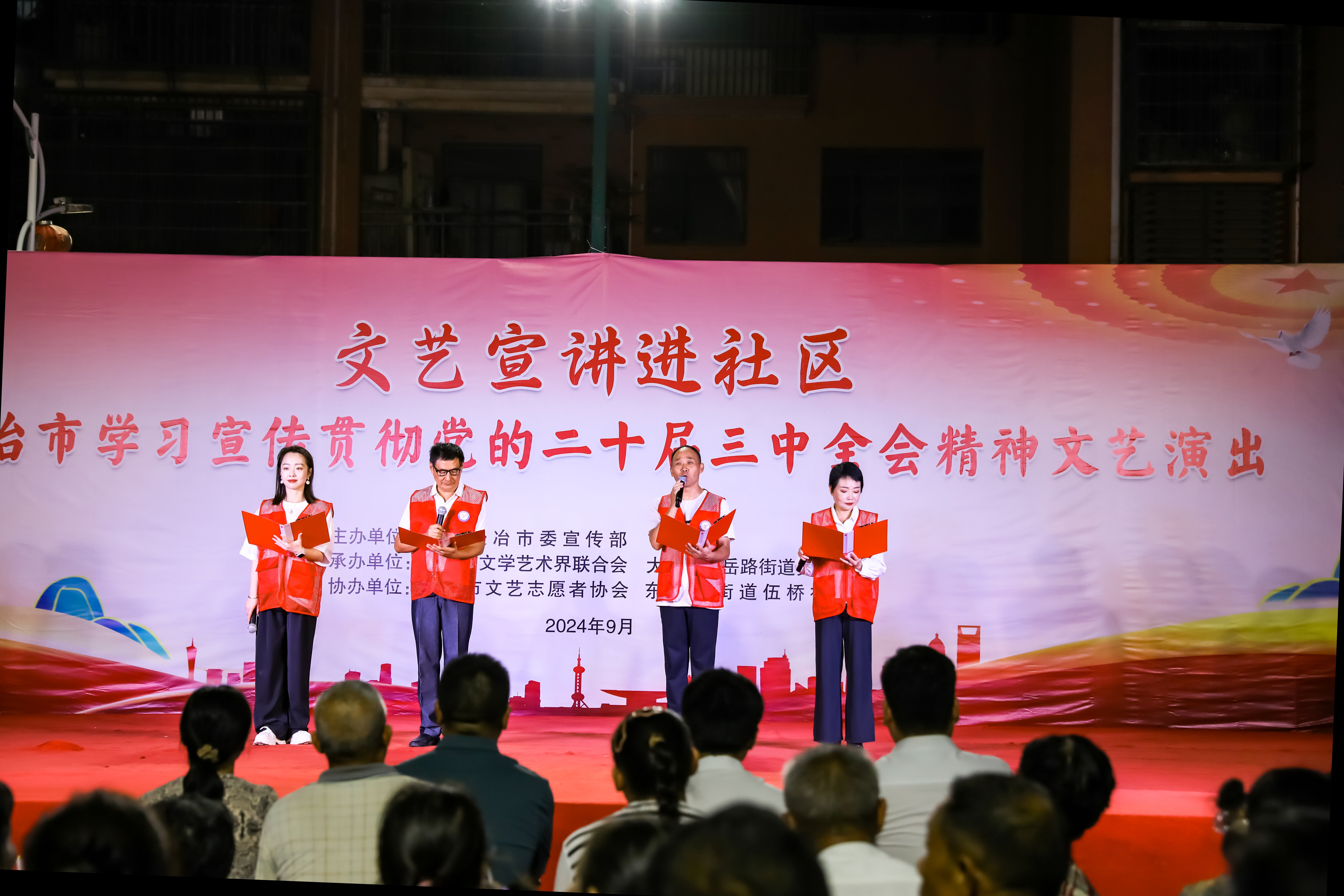 活動伊始,大冶市文聯(lián)、東岳路街道黨工委分別以“推動文化繁榮,豐富人民精神文化生活”和“夯實基層治理基礎共同締造幸福伍橋”為主題開展了理論宣講。隨后,演出在優(yōu)美動人的開場舞《祝福祖國》中拉開帷幕,活力球操《舞動青春》青春洋溢,快板舞《全會精神放光芒》韻律十足、展現(xiàn)特色,多個節(jié)目輪番上演,精彩不斷,期間穿插黨的二十屆三中全會精神有獎問答,現(xiàn)場居民踴躍參與,氣氛熱烈。