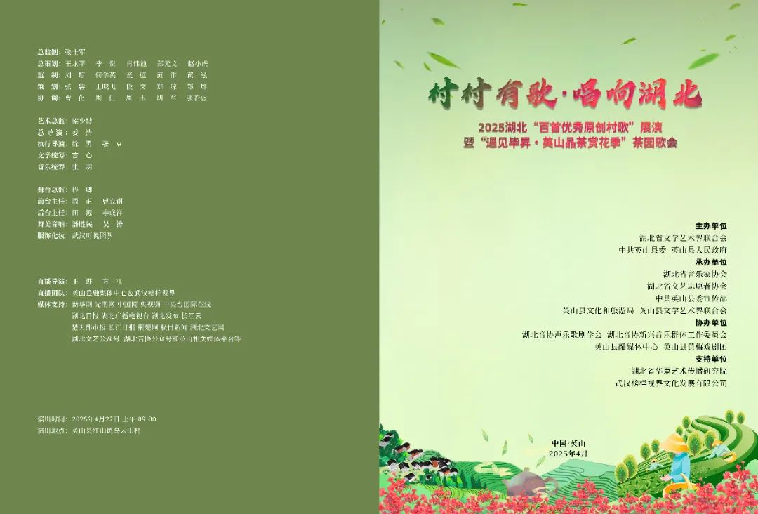 本次活動由湖北省文聯、英山縣委、縣政府共同主辦,省音協、省文藝志愿者協會、英山縣委宣傳部、英山縣文化和旅游局、英山縣文聯承辦,省音協聲樂歌劇學會、省音協新興音樂群體工作委員會、英山縣融媒體中心、英山縣黃梅戲劇團協辦。