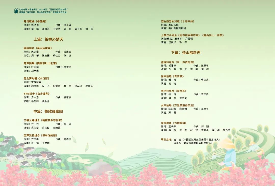 湖北優秀原創村歌《山鄉龍井》由洪晶晶、易先麗演唱,歌曲以輕快旋律描繪出鄉村茶產業發展的美好景象。三峽幺妹組合帶來的《我在茶鄉等你來》,洋溢著濃郁的采茶季氛圍,傳遞出對游客的熱情邀約。夏恒、于文皓演繹的流行歌曲《爺爺泡的茶》,用年輕人喜愛的方式詮釋了家的溫暖與茶文化的韻味。