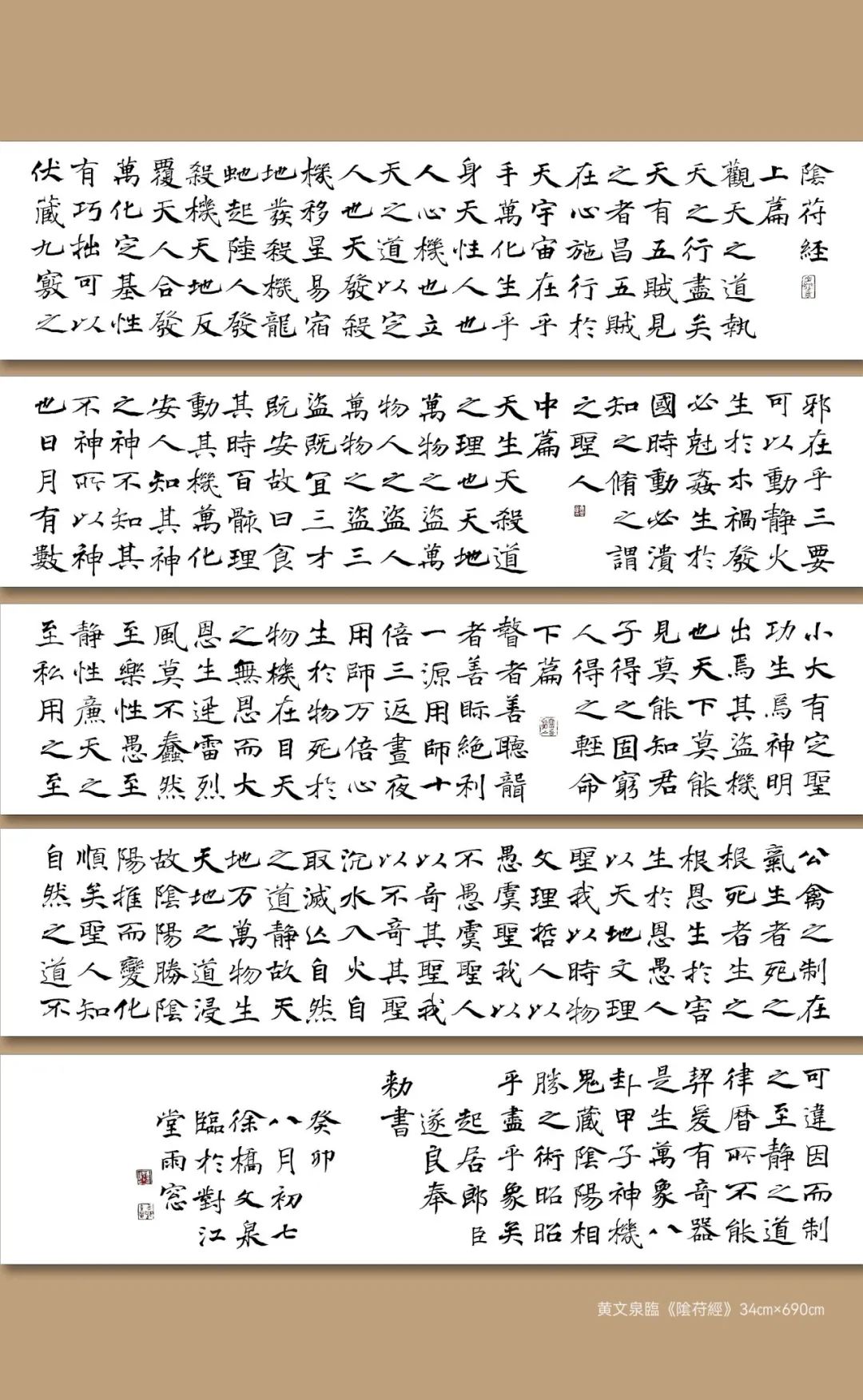 從結(jié)構(gòu)上看,黃文泉通過大量臨習(xí)褚遂良的《大字陰符經(jīng)》等經(jīng)典作品,努力攻克結(jié)構(gòu)方面的難題。他的楷書結(jié)構(gòu)嚴(yán)謹(jǐn)、疏密得當(dāng),各部分之間相互呼應(yīng)、協(xié)調(diào)統(tǒng)一。同時(shí),他又大膽創(chuàng)新,將行草的用筆融入楷書,打破了傳統(tǒng)楷書結(jié)構(gòu)的呆板,使其更具靈動(dòng)性和變化性。他的字時(shí)而舒展大氣,時(shí)而緊湊內(nèi)斂,給人一種跌宕起伏的視覺感受。