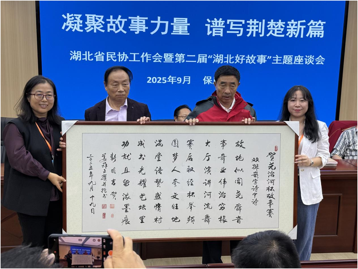 聽到大家關于故事的發言,來自宜昌市夷陵區的已經80歲的民間文藝家彭明吉先生激動不已。彭先生動情地和大家講述他和堯治河村黨委書記孫開林認識及孫開林把堯治河村從一個貧窮落后的小山村打造成全國幸福村的故事,還帶來了92歲高齡的姜祚正老先生書寫的贈送給“堯治河杯”故事大賽的牌匾。